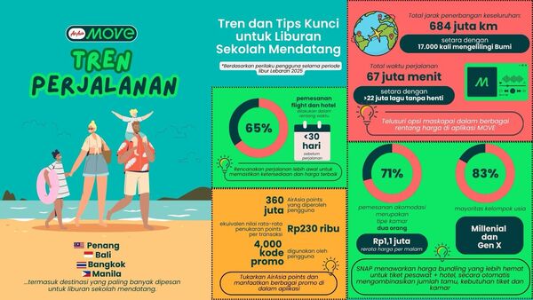 “Data internal kami menunjukkan bahwa destinasi seperti Penang, Bali, Bangkok, dan Manila menjadi pilihan favorit untuk liburan sekolah mendatang. Ini menandakan tingginya minat terhadap destinasi regional yang ramah untuk keluarga dan pasangan,” kata Marketing Manager AirAsia MOVE Indonesia, Amelia Virginia melalui siaran persnya.